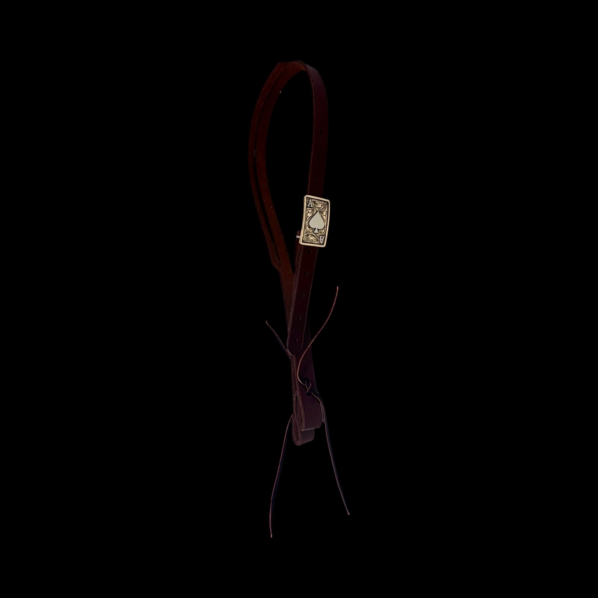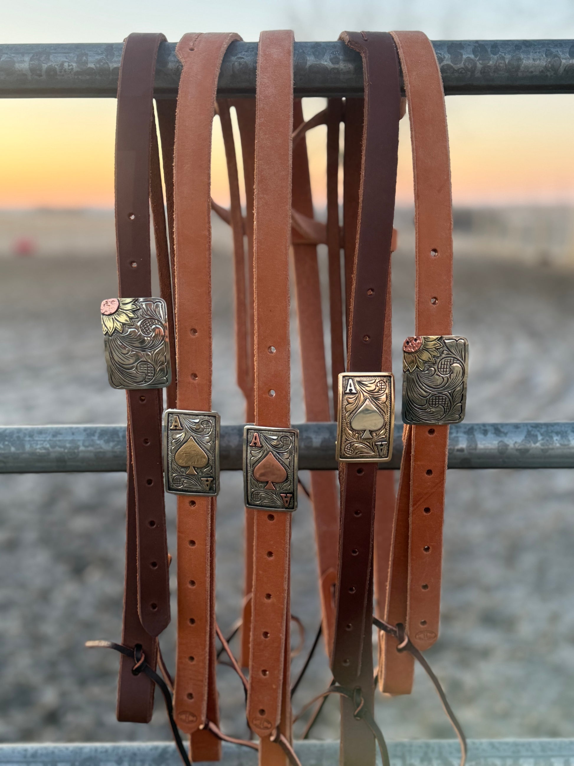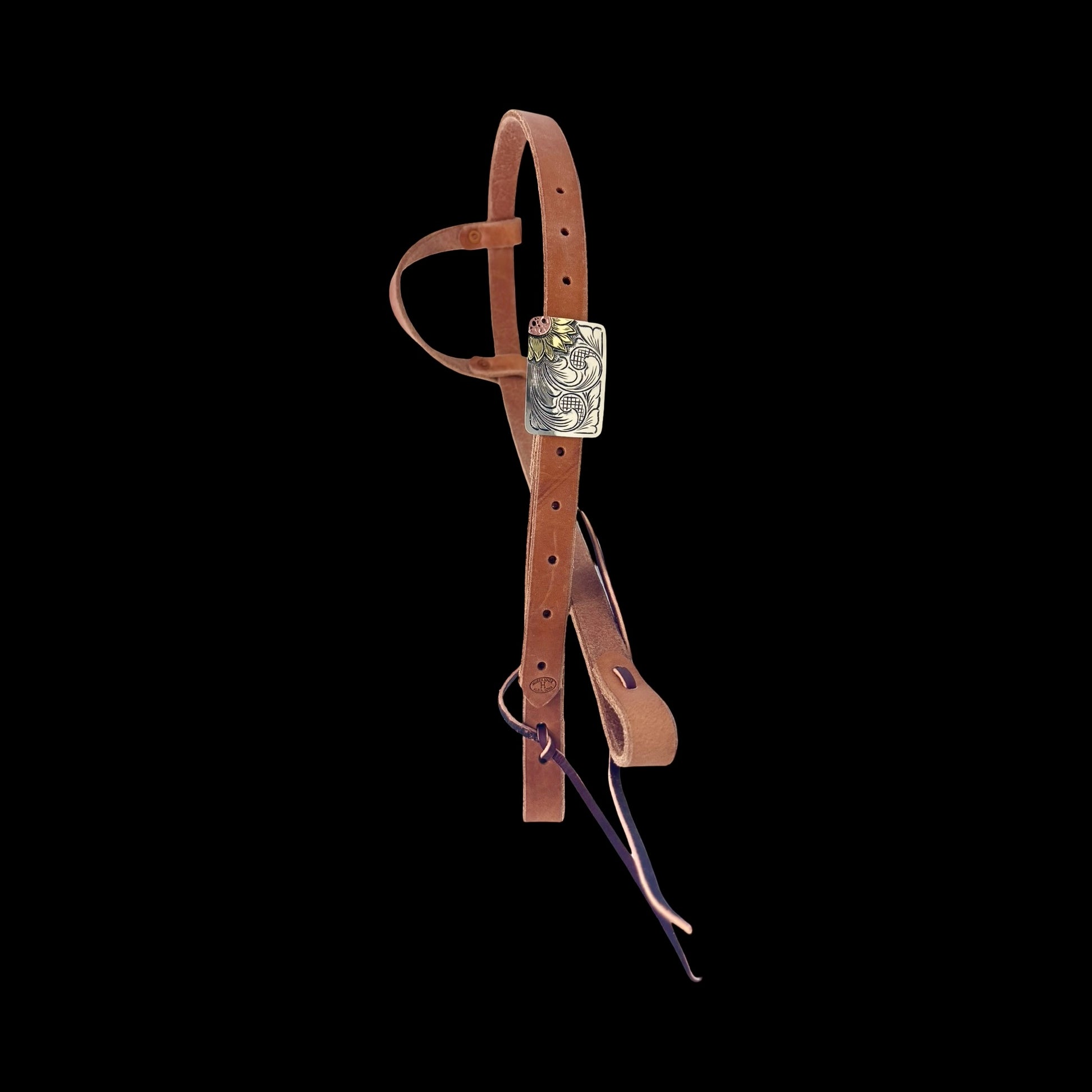 Plate buckle headstalls on leather by Cody Huber, at Huber Saddle Shop and Customs. These plate buckles are handcut and handcrafted on natural and dark oiled leather in either a split ear or single ear headstall.